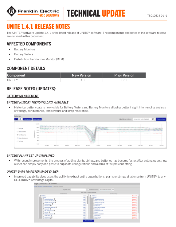 UNITE™ ofrece vistas detalladas de todos los indicadores clave de rendimiento para cada planta, cadena de baterías y batería individual dentro de su red. Permite seleccionar y comparar varios atributos de las baterías (como voltaje, temperatura, conductancia, resistencia de interconexión y conductancia compensada por temperatura) para visualizar rápidamente las tendencias de rendimiento.